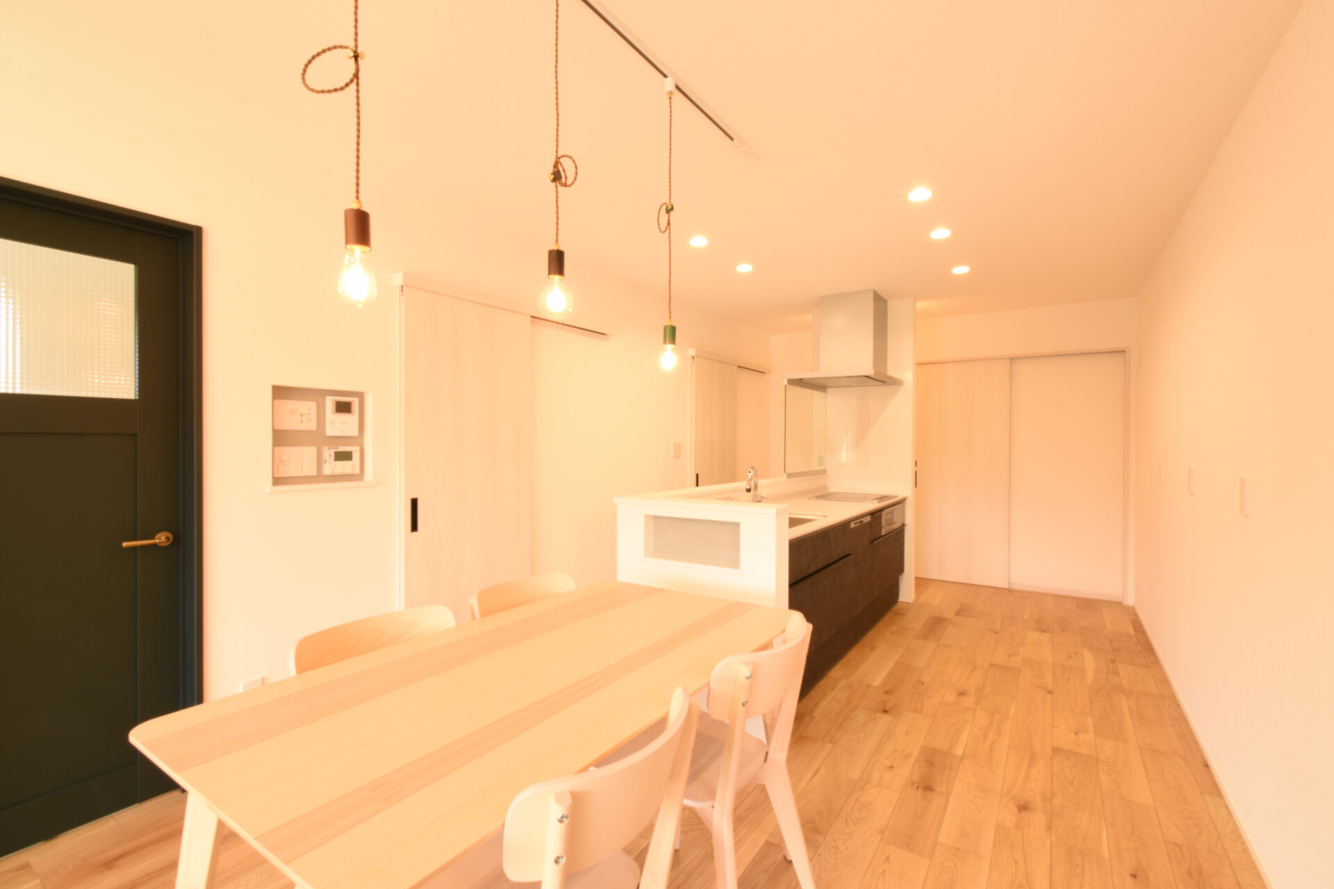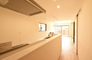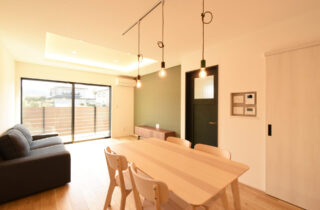 LDKはキッチン・ダイニング・リビングが横並びでスッキリ広々としている。リビングの上部は折り上げ天井で、天井を優しく照らす間接照明を仕込んだ。