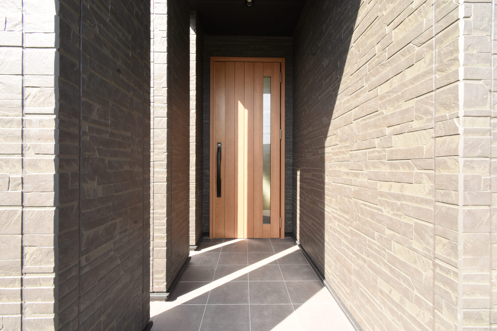 スリットから光が差し込むポーチを通り、玄関ドアを開けると奥行きを広く設けられたタイルスペース広がっている。