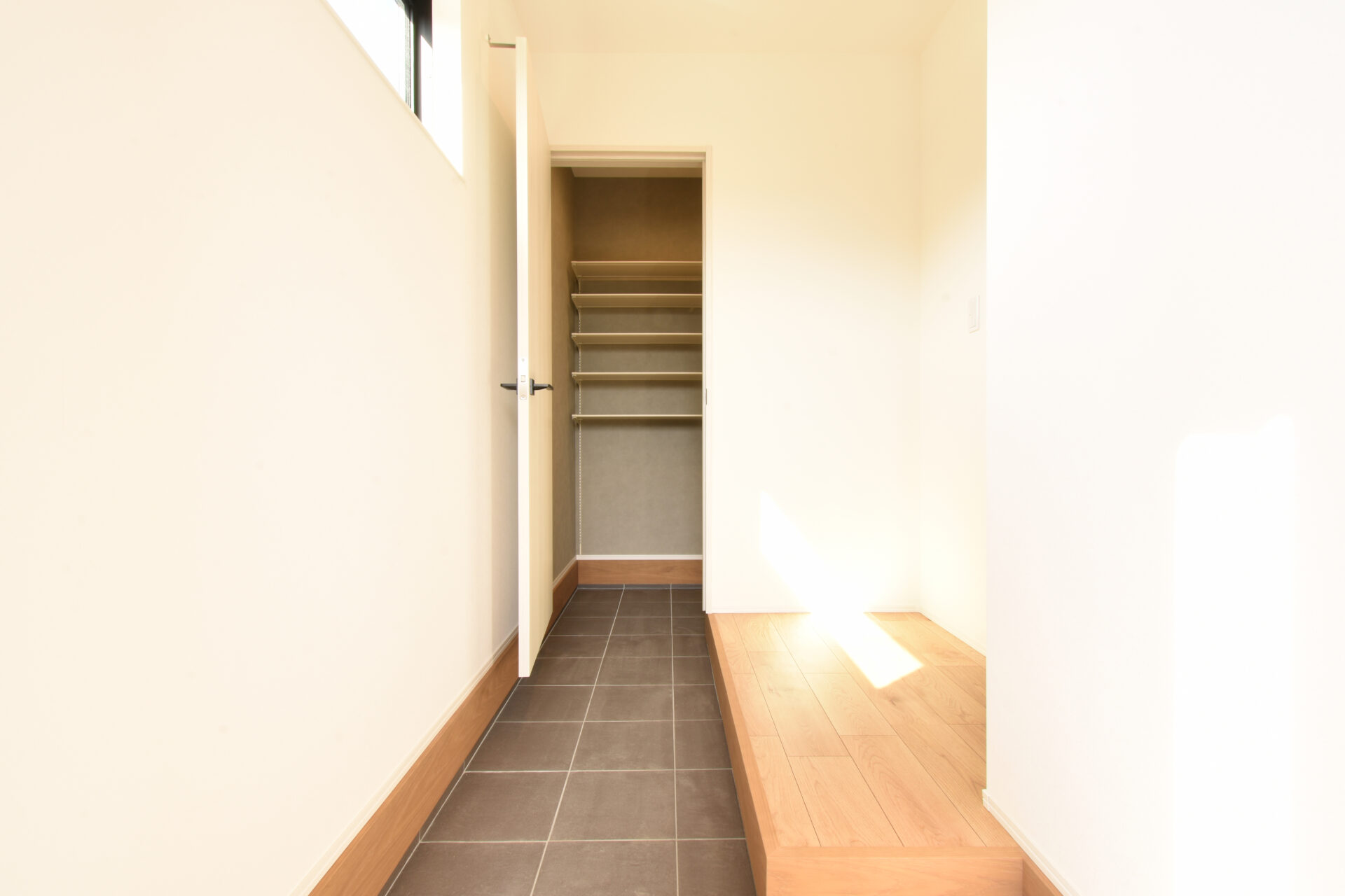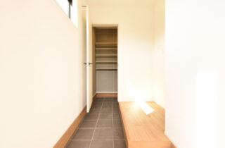 その突き当りはシューズクロークで、靴のまま入って中で靴を脱いでリビング側へ直接入ることができるつくり。