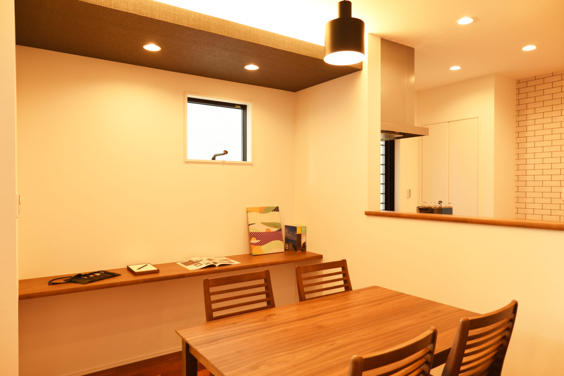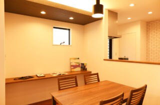 ダイニングの天井にひと工夫、間接照明を仕込んでいます。壁や天井を照らすあかりは目に優しく、さらに空間に奥行きを感じさせる効果があります。調光式ですので様々な雰囲気を味わうことができます。