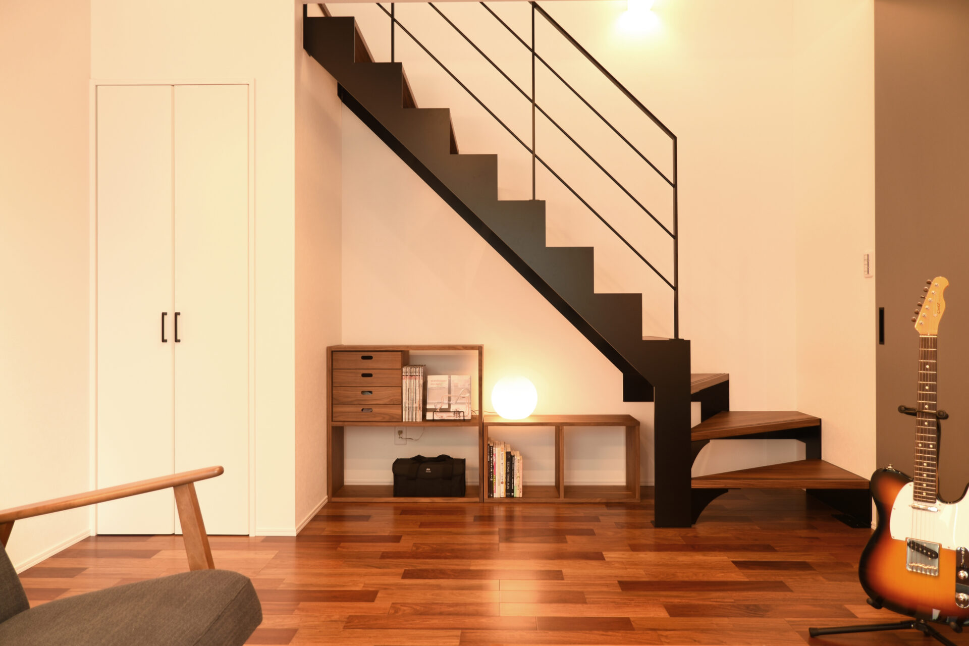 この建物の最大の特徴はスチール製の階段。既製品ではなく、職人が丁寧に仕上げたオリジナルの逸品です。塗装にはショットブラストという手法を用いており、深みのあるブラックが目を惹きます。
