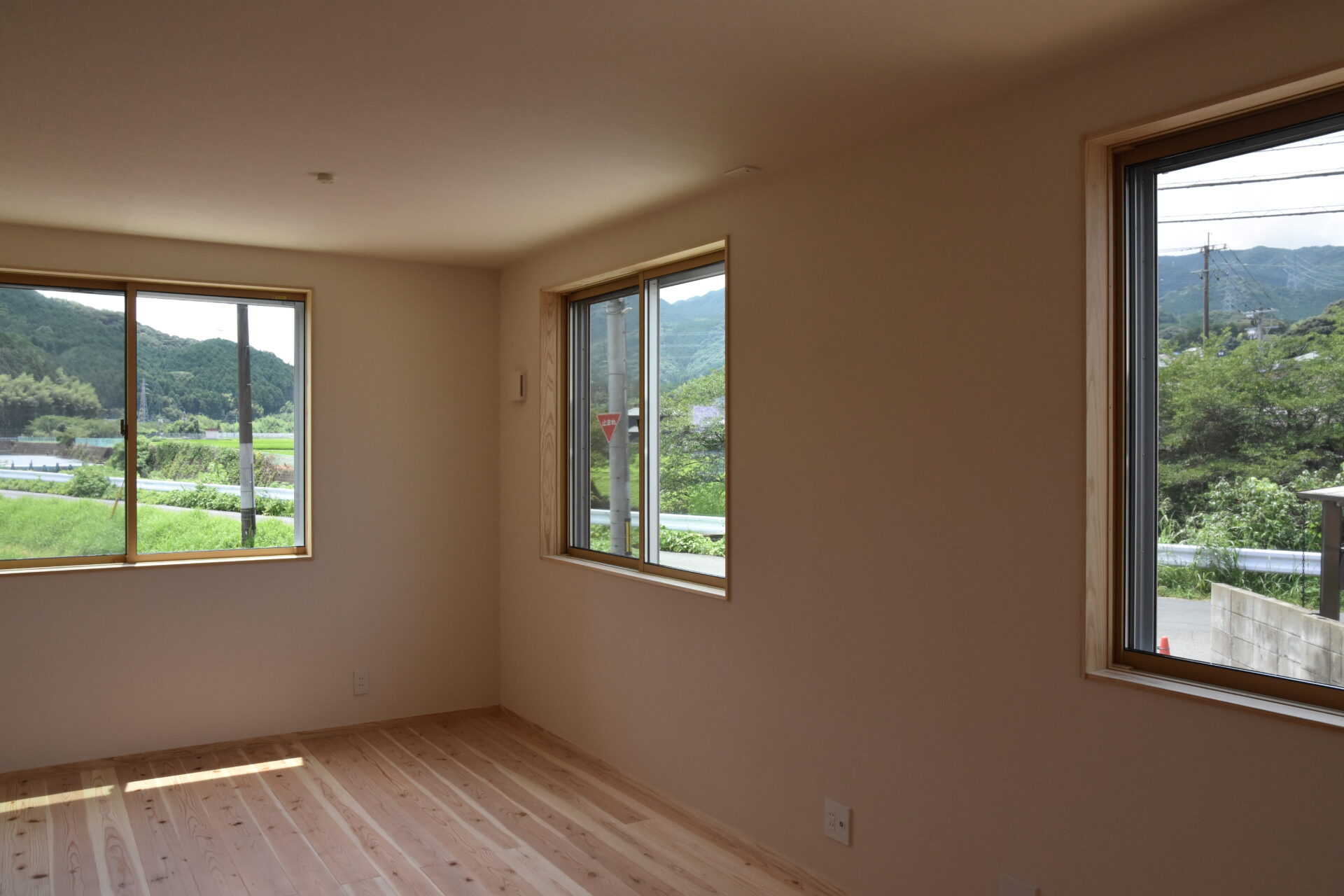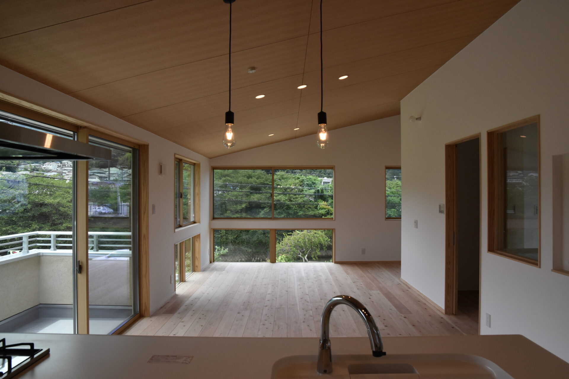 家族が集うリビングはその眺望を最大限に活かすため2階に設けた。床には杉の天然木材を採用。