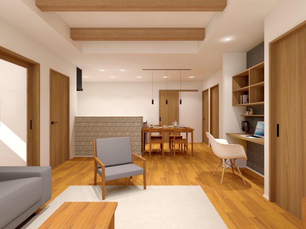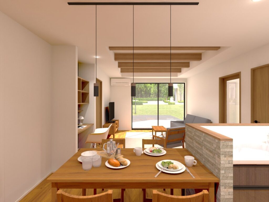 また、リビングの天井は化粧梁風の施工になっており木造の温かみや奥行き感が出る作りになっております。