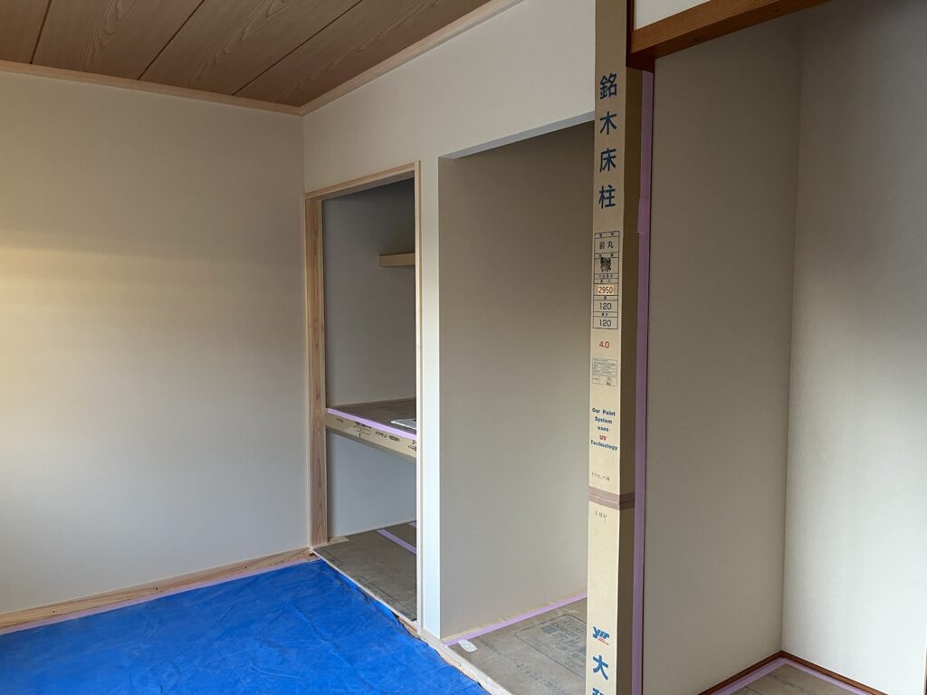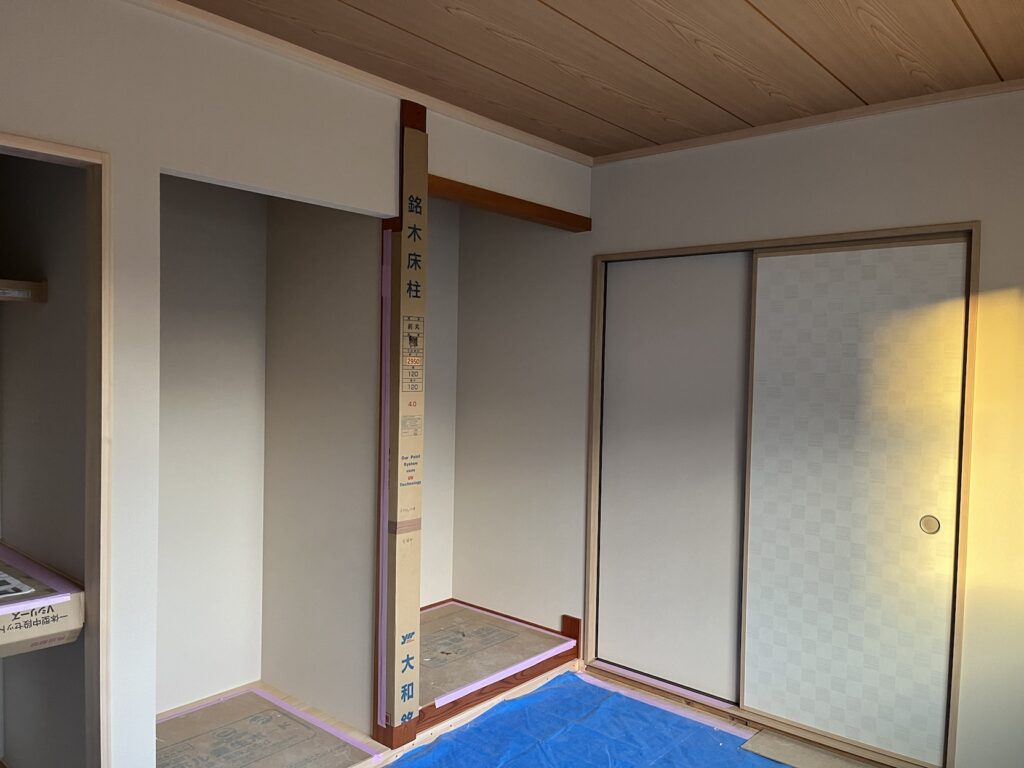 心待ちにしていた和室の天井板、床の間、落掛、床柱、仏間縁甲板も完成し非常に格好良い作りになりました。