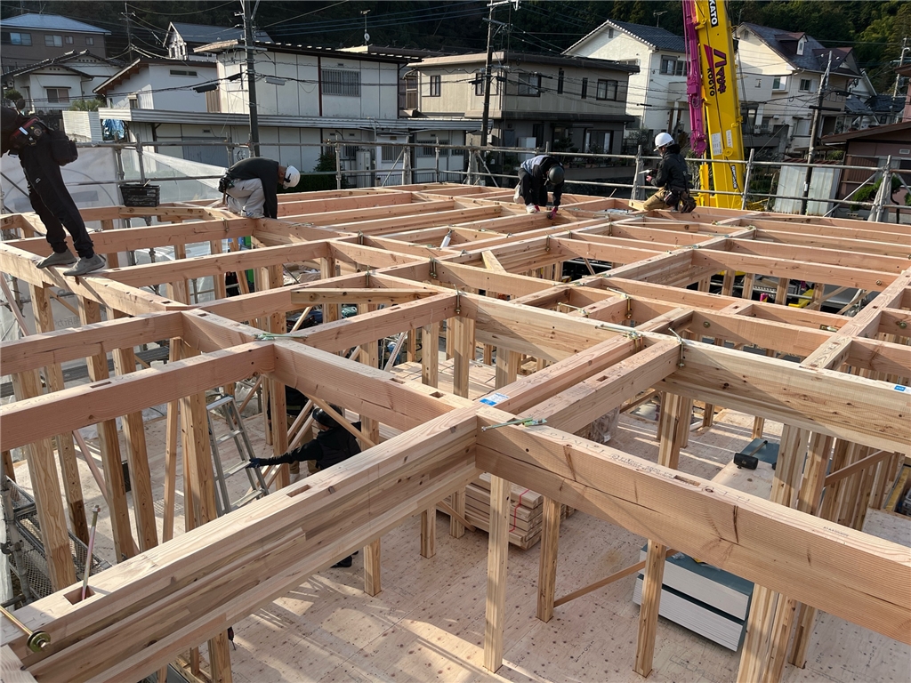 5号地にはコンセプトハウス『THR FLAT PORCH』を建築中で先週、棟上げを行いました。