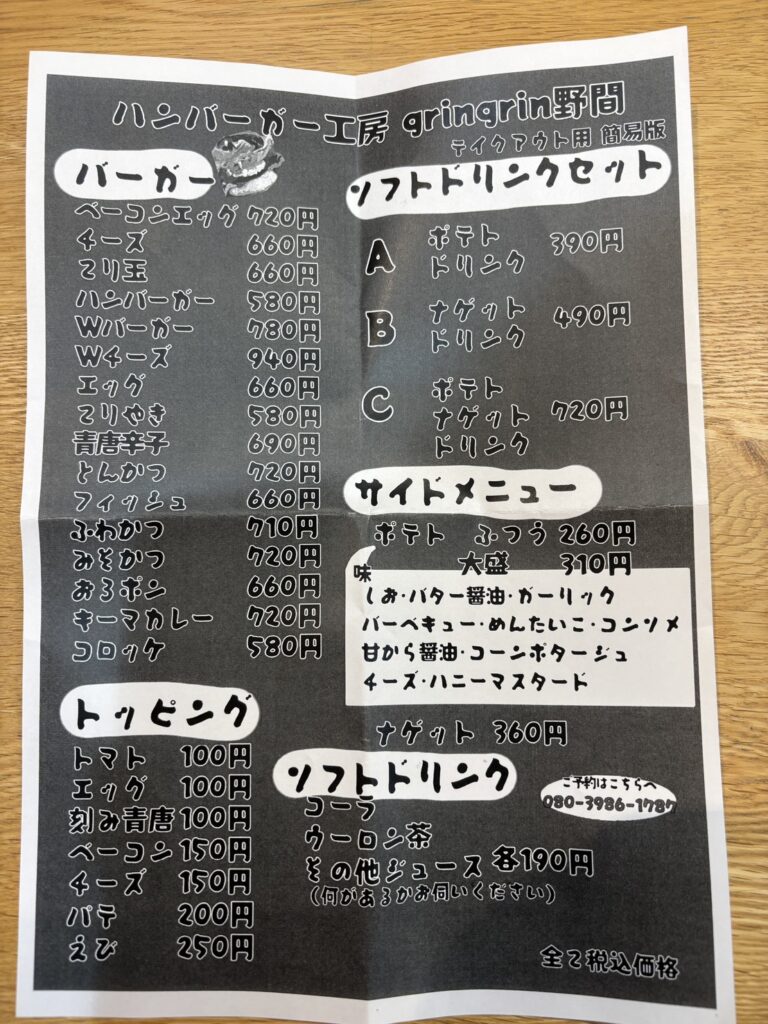 テイクアウト用の簡易メニューももらいましたので載せておきます!