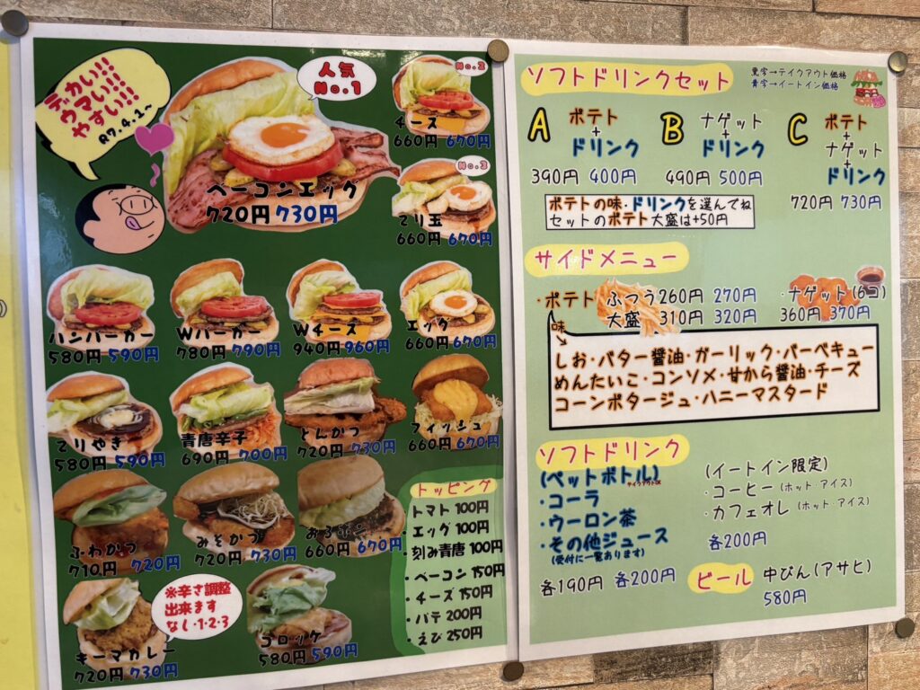 バーガー1個の単価は少し高めかなと感じるかもしれませんが、バーガーがかなり大きいのでバーガー単品でもお腹いっぱいになります!