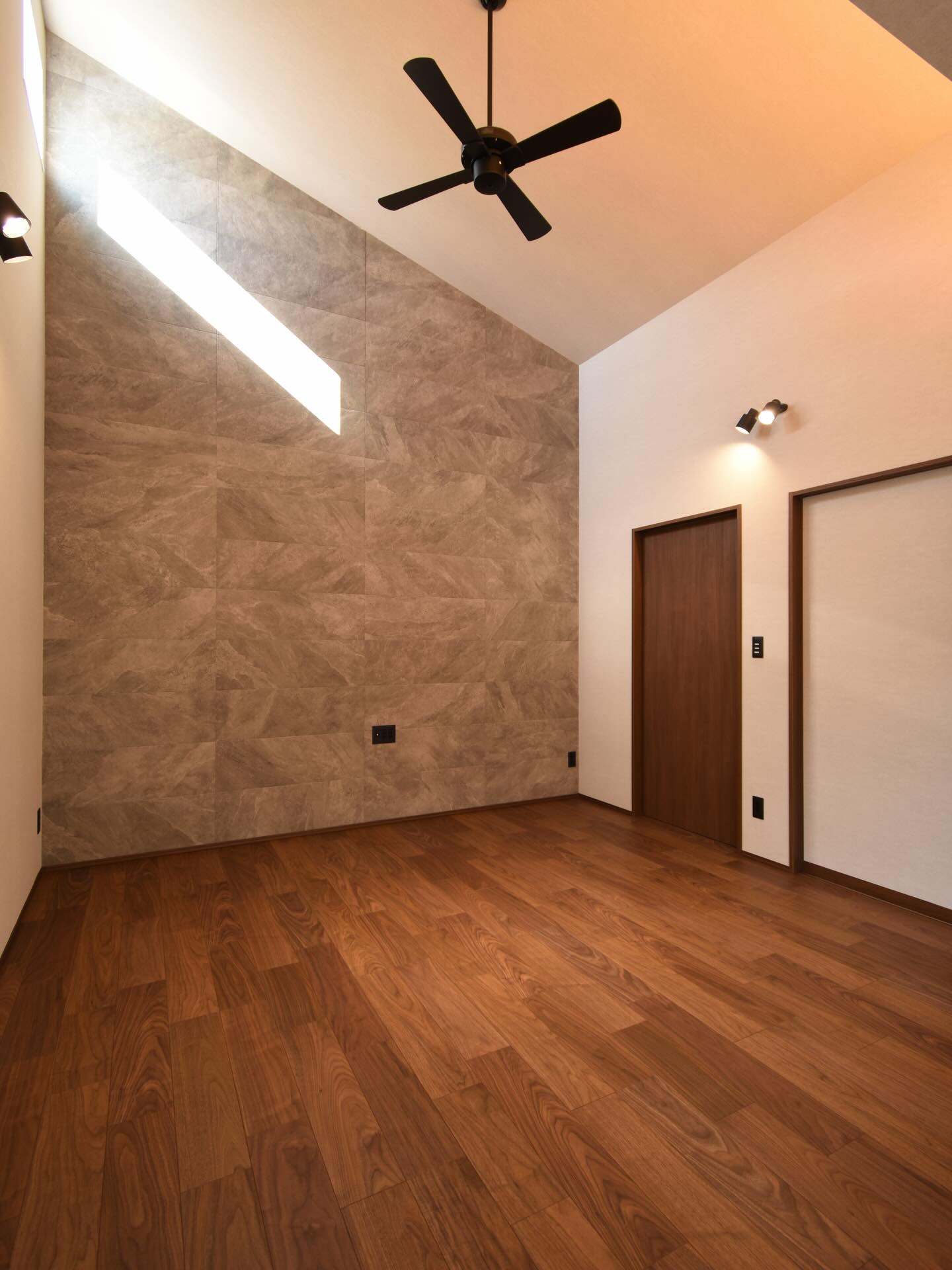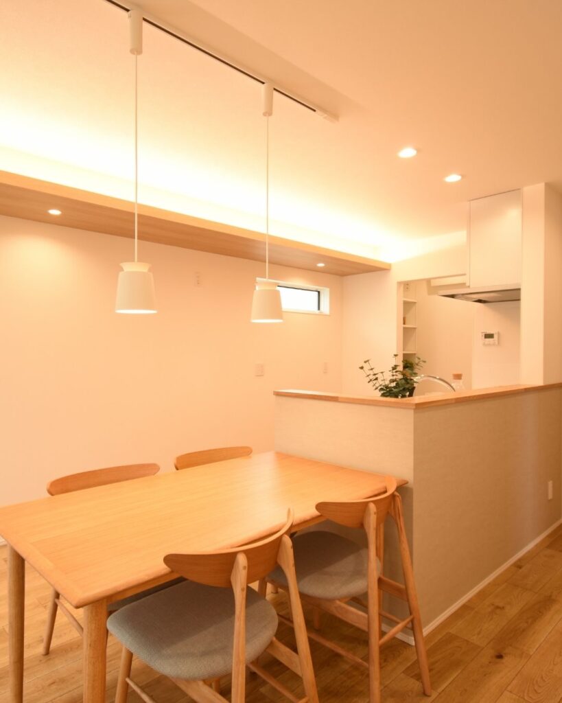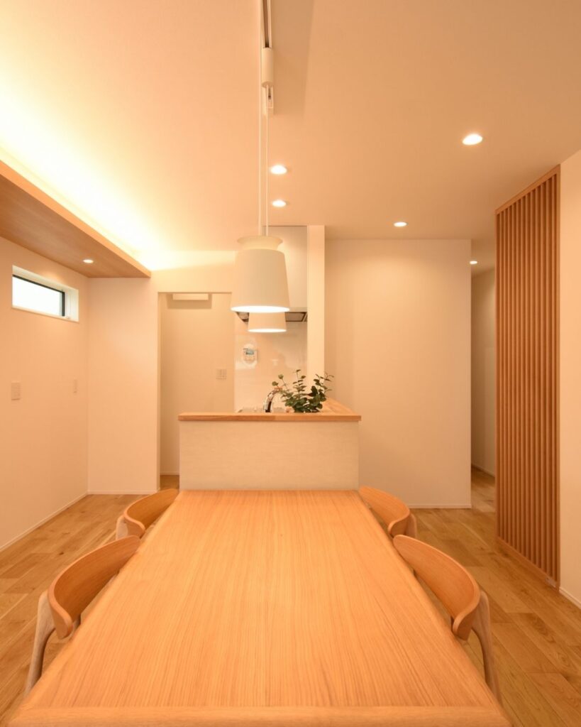 控えめな光の中でも質感がしっかりと息づき、LDK全体の空気を整えながら“形づくる”存在です。