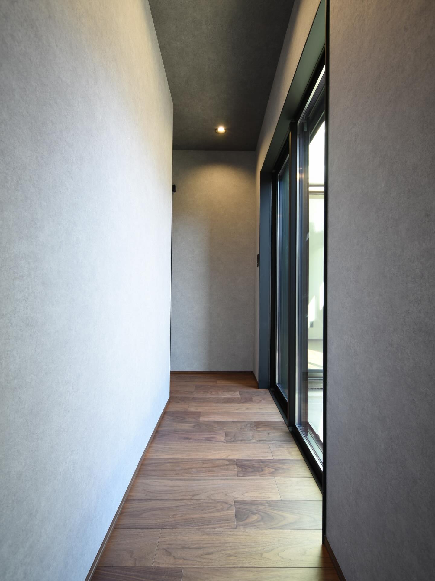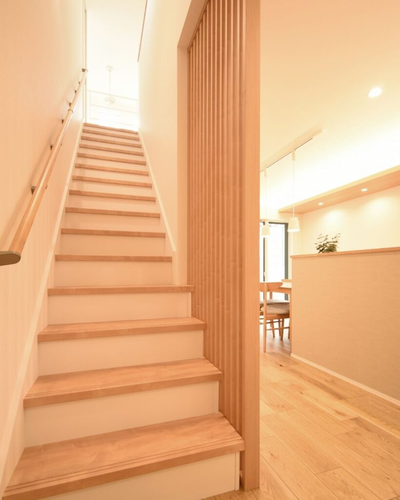 次の事例では主寝室や水回りへつながるキッチン前の通路と階段の間にインテリア格子を採用しました。すっきりとした縦ラインが美しい格子が空間を緩やかに仕切ります。