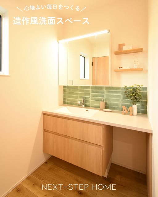 モルタル調カウンターと木目調扉の造作風洗面台にグリーンのタイルでアクセントを加えて優しい雰囲気の洗面スペースに仕上げました。