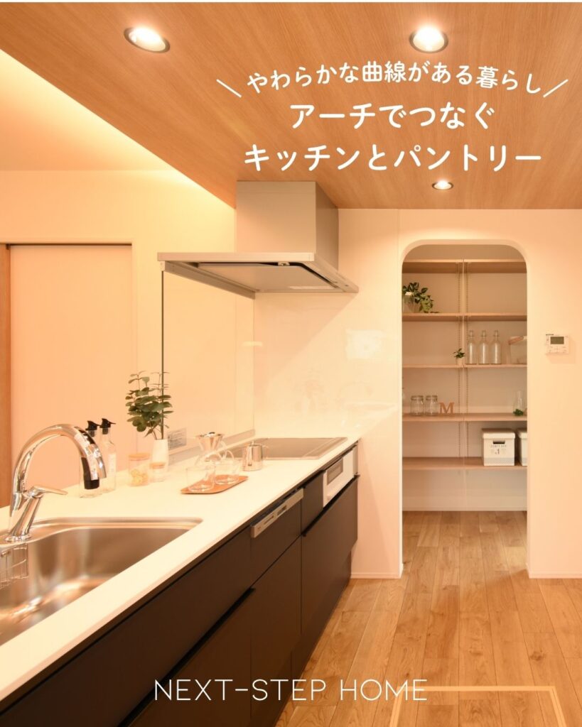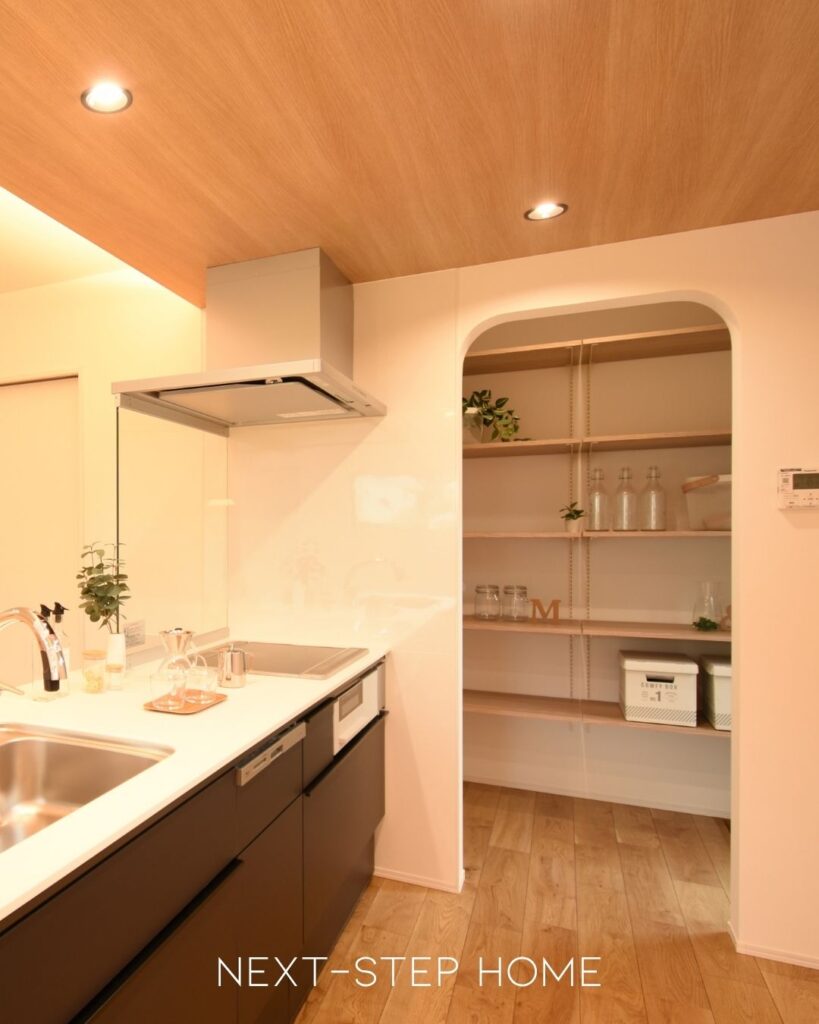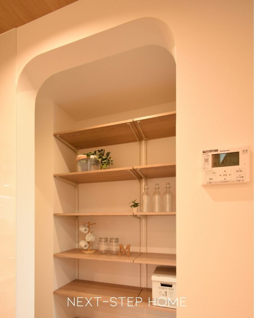 キッチンから続くパントリーへの入り口は角をなくしたアーチ型にやわらかな曲線を加えることでやさしくほっとする雰囲気になりました✨