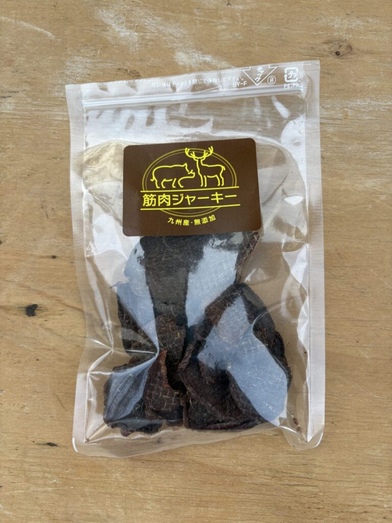 その中で畑を荒らす野生動物から農家さんを守るために行った狩猟で出た廃棄部分を活用し、オーガニックのジャーキーを作っているという方のお店があり、ジャーキーを購入してみました。