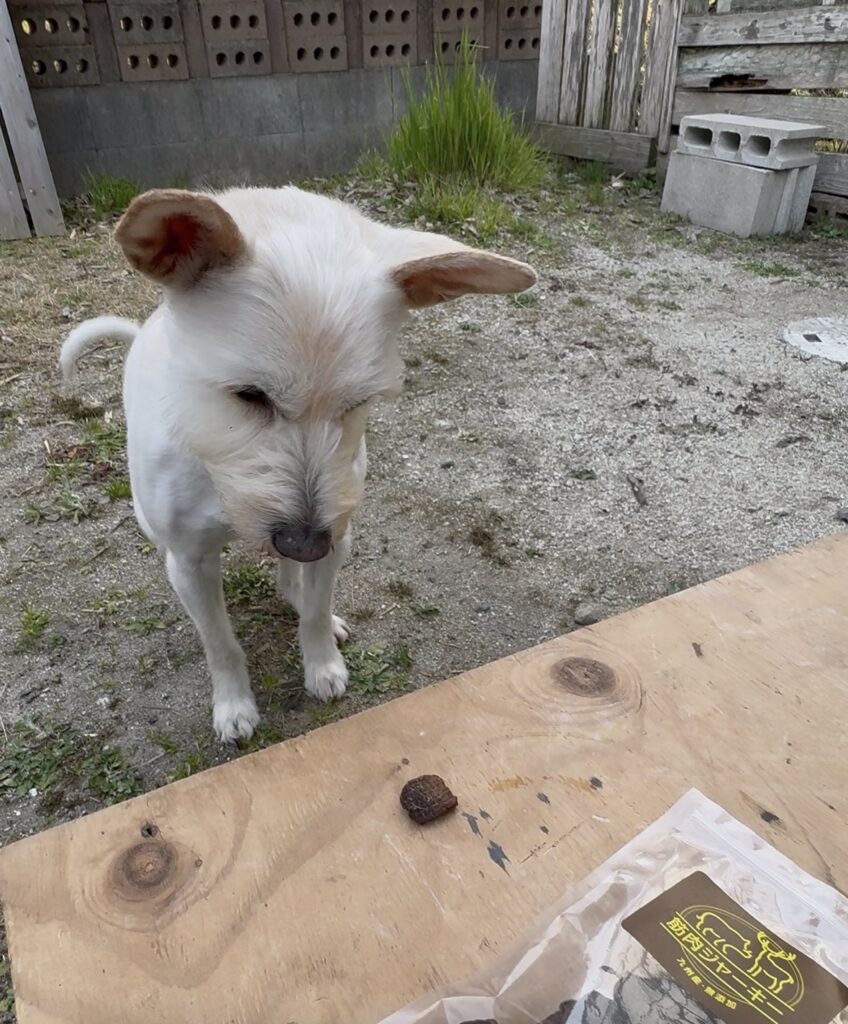 リンちゃんはおやつ前の『お座り』『待て』もままならぬジャーキーにかぶりついていました(^^;)